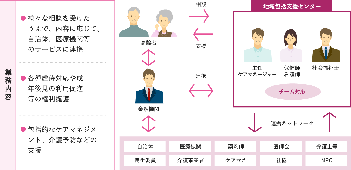 全国すべての都道府県および市区町村にある高齢者をはじめ福祉全般をカバーする、地域の福祉司令塔です。