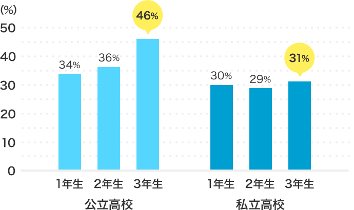 公立・私立ともに、高校3年生の約3割~4割は塾に通っています。高校1年生や2年生のときと比較するとその割合は伸びており、大学受験に向けてより多くのお子さまが塾に通い始めるようです。