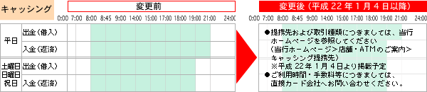 - (2)「お預け入れ」「お振り替え」「現金でのお振込」「キャッシング返済」のご利用時間が短くなります。