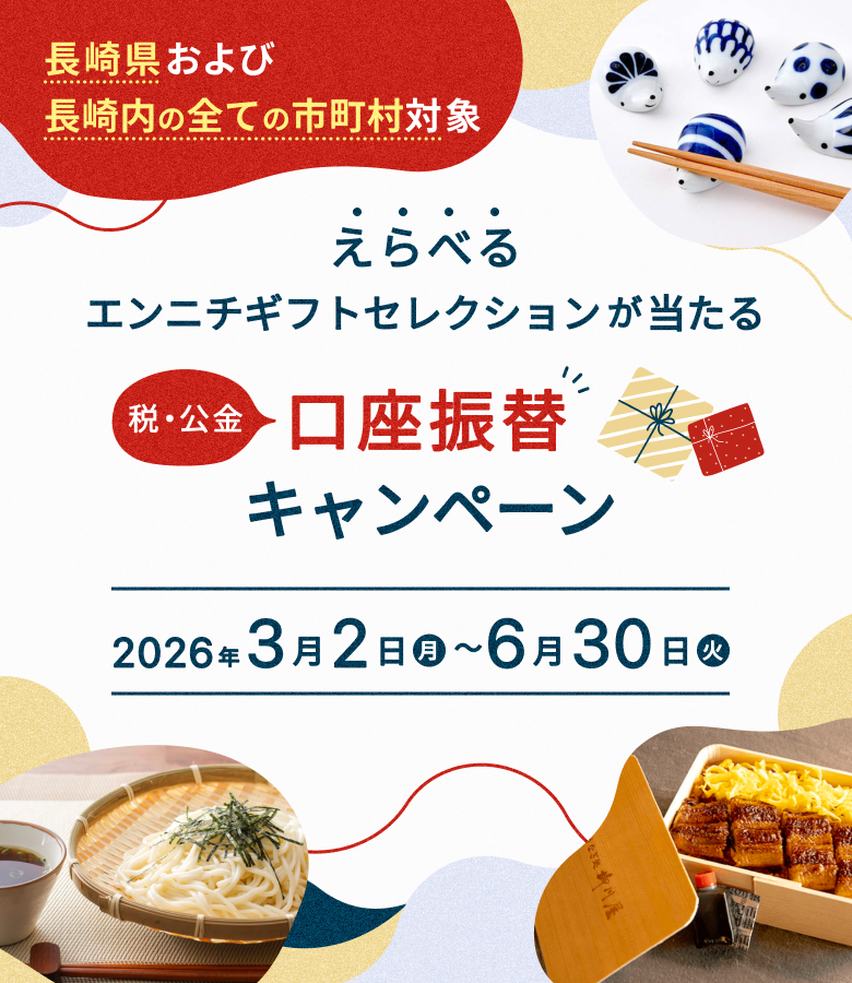 ・キャンペーン期間中に十八親和銀行で、長崎県及び長崎県内の市町村のいずれかで税・公金の口座振替を新規お申込みいただいた方が対象となります。