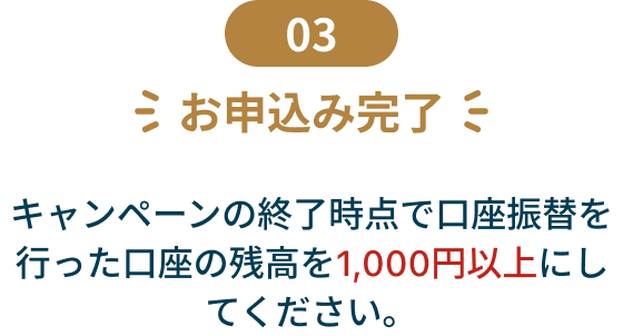 - キャンペーンの終了時点で口座振替を行った口座の残高が1,000円以上の方