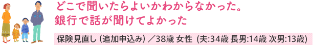 言われるがまま入っていた保険で、まったく保障内容を理解していませんでした。銀行で保険を取扱っていることも知りませんでしたが、住宅ローンの申し込みにあわせた家計の見直し提案のおかげで、保険を見直す良いきっかけになりました。